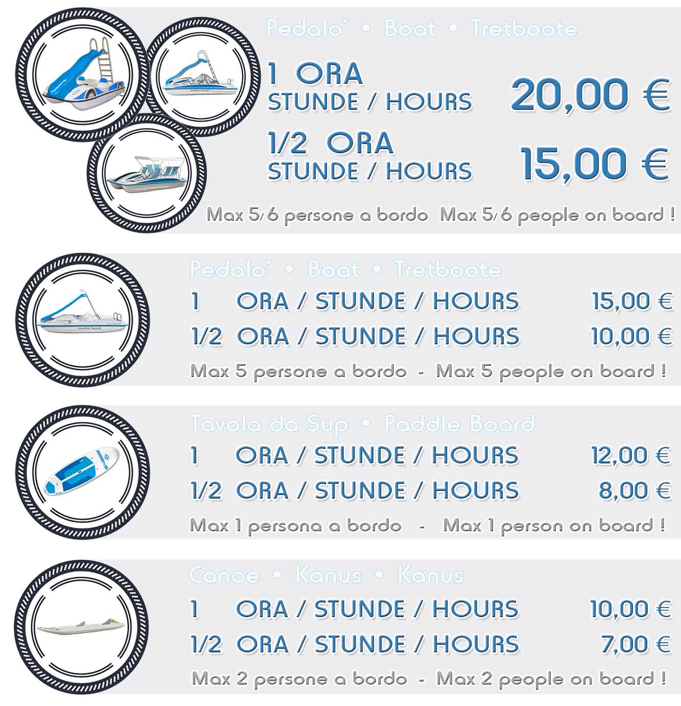 Noleggio dalle ore 09:00 alle 12:00 & dalle 14:00 alle 19:00 It is possible to rent the boats from 09:00 to 12:00 and from 14:00 until 19:00